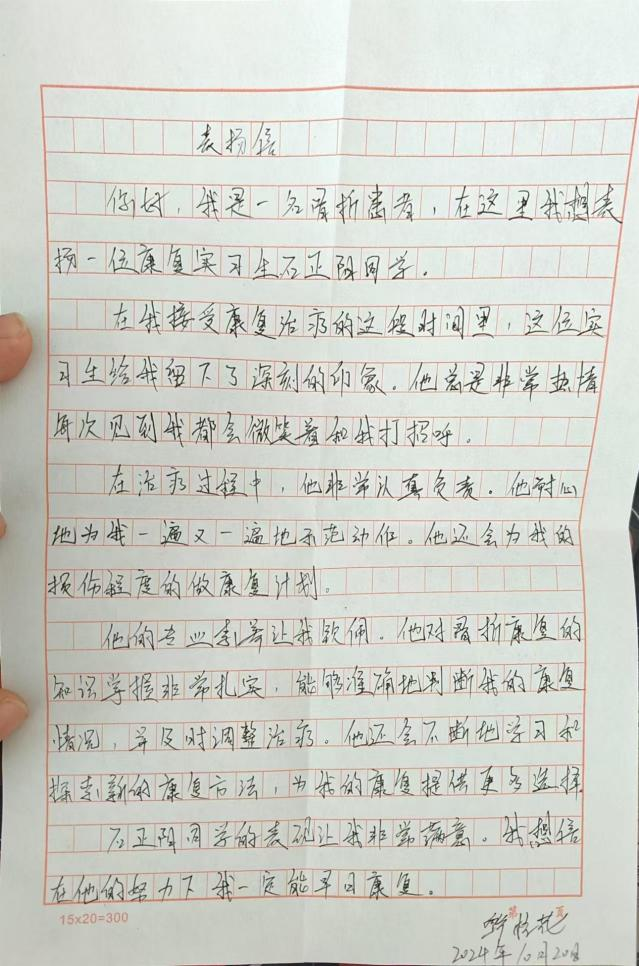 commendation letter. At that moment, my heart was filled with a sense of achievement, and my belief in the rehabilitation field was further strengthened.